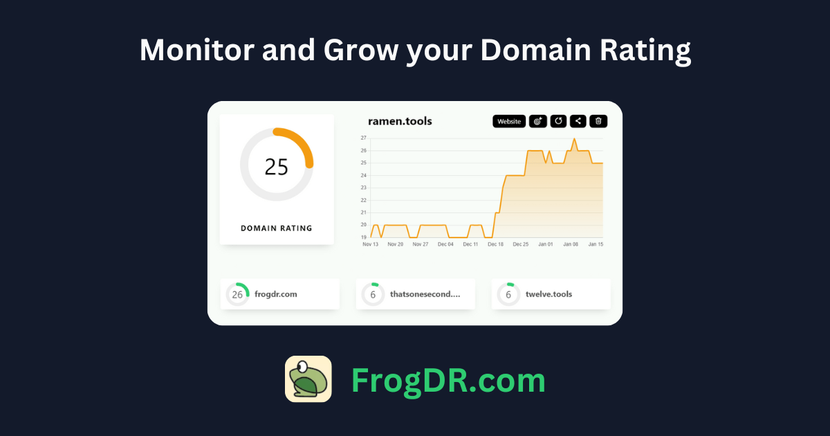 FrogDR is a tiny website that automatically tracks your DR (Domain Rating) everyday. It also helps you increase your website’s domain authority and SEO by giving you some tasks and backlinks opportunities.