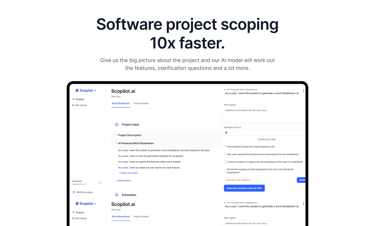 Scopilot.ai redefines project scoping by using AI to turn simple project descriptions into comprehensive scopes in no time. The platform generates detailed feature sets, user stories, and clarification questions, automating what used to be a time-consuming manual process. This efficiency boost allows software agencies and developers to spend less time on planning and more on development. With Scopilot.ai, enjoy a streamlined workflow that enhances accuracy and accelerates project planning, making it easier to deliver high-quality software on schedule.